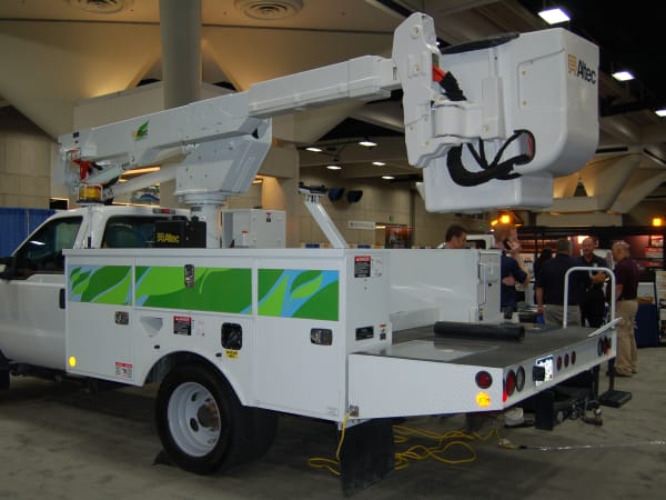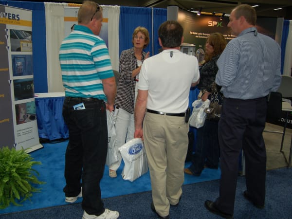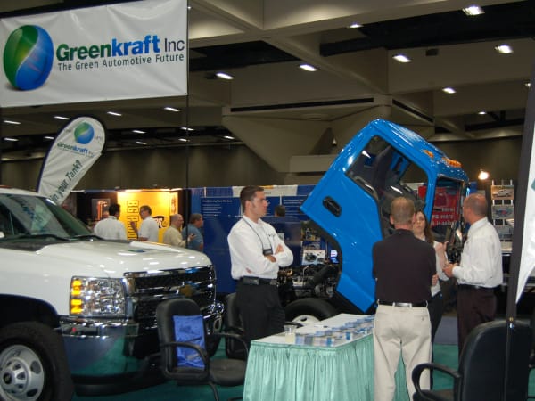 Staff from GM speak with attendees about the automake's fleet vehicles.