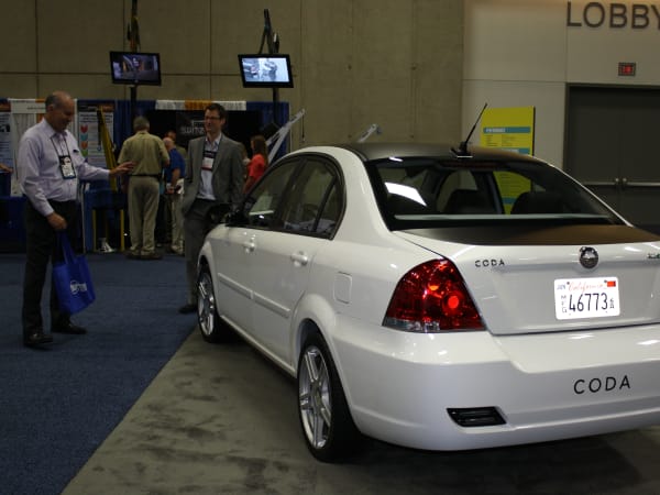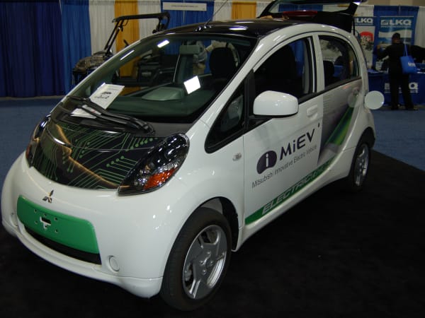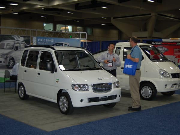 A representative from Miles Electric Vehicles speaks with an attendee.