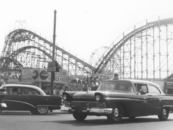 In the 1950s, the NYPD used the Ford RMP (Radio Motor Patrol). This photo shows one at Coney Island in 1956. Note the passenger-side-only spotlight.