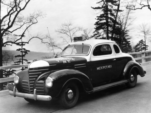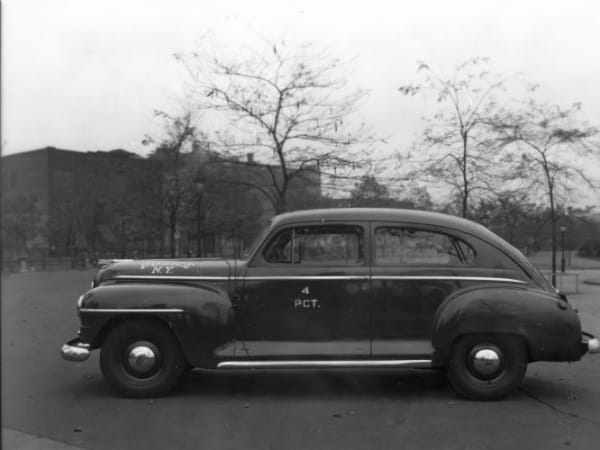 During the Second World War, NYPD officers drove two-door Plymouth radio cars without roof lights. This photo is from 1946.