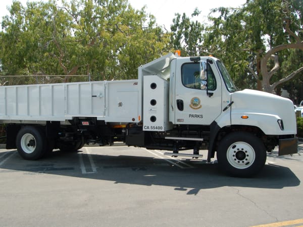 CNG-powered Freightliner SD114 with Ctec body stakebed dump truck from the City of Whittier.