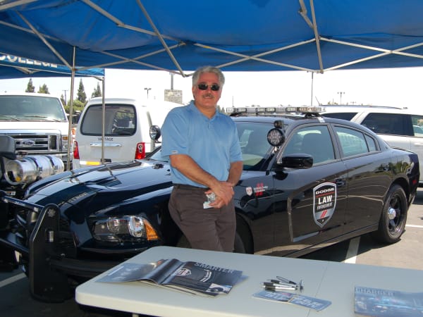 Municipal Equipment Maintenance Association (MEMA) vehicle and equipment showcase: Eric Gierst, regional fleet service manager, Chrysler Group, with a Dodge Charger police vehicle