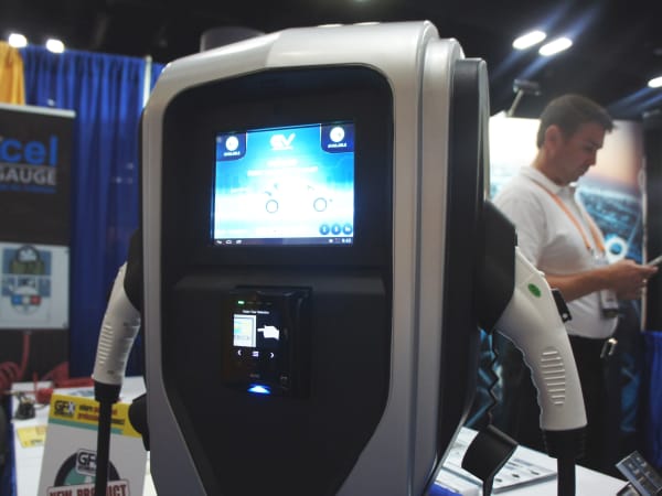 Excel Tire Gauge's new electric vehicle charging station is an open-payment Level 2 charger that allows two vehicles to charge at once. The color touchscreen payment interface allows for multiple cashless options, including card swipe, chip card, and contactless payment options.