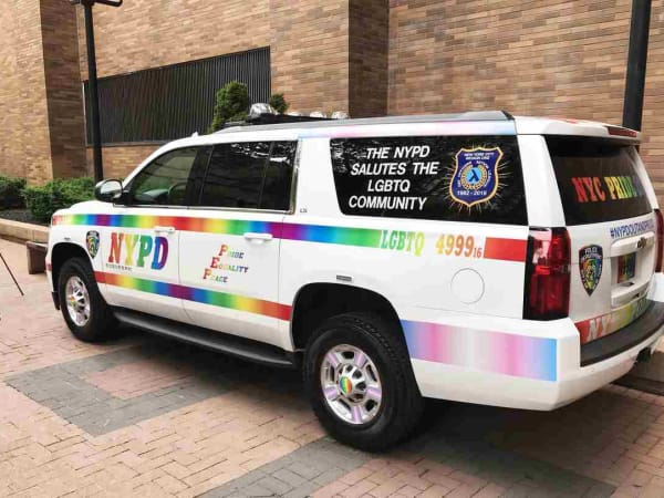 Lesbian, Gay, Bisexual and Transgender Pride Month is celebrated every June, and this wrapped police car celebrates pride.