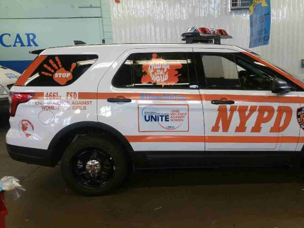 This police car celebrates Orange Day, designated the 25th of every month and amplifies the United Nations' UNiTE to End Violence against Women campaign.
