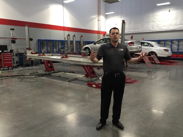 In a body repair class, an instructor assigns dents to studentst to fix.