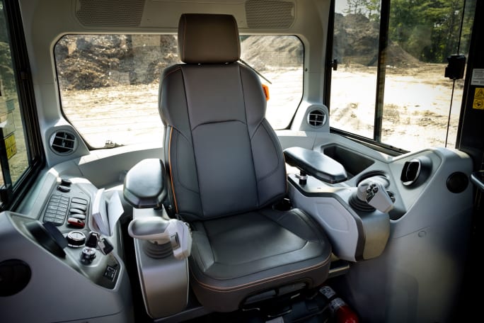 The cab’s low-profile front pillars provide maximum glass area, and all-glass doors provide a full view of the working environment.