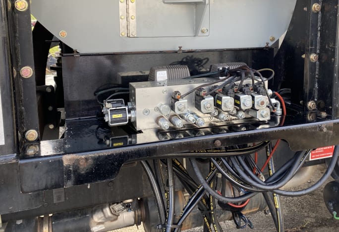 This is what the valve body for a commercial leaf vacuum truck looks like before it has been replaced with Really Good Equipment's electric solution.