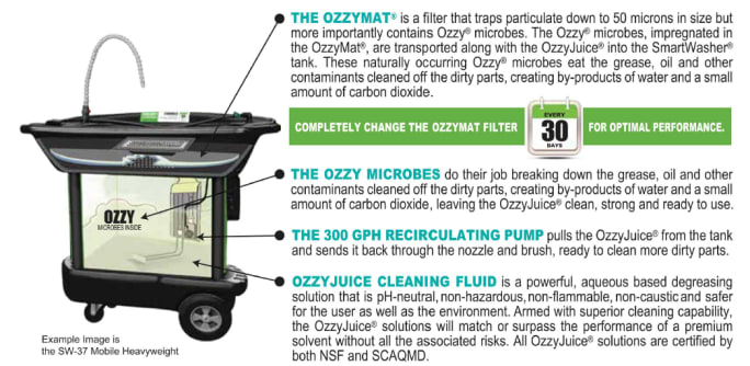 The SmartWasher Bioremediating Parts Washing System is designed to be both self-cleaning and environmentally friendly. Through the process of bioremediation the SmartWasher constantly maintains the cleanliness of the OzzyJuice cleaning/degreasing solution without the need for hauling, skimming, evacuating the unit.
