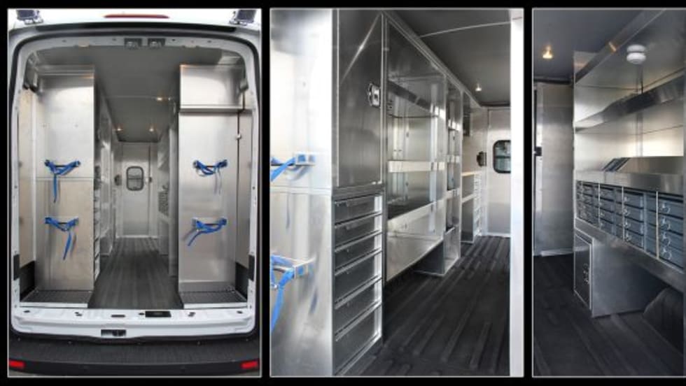 The Transit Van Utility Service package is manufactured from heavy gauge aluminum with shelving, storage cabinets, a workbench, and drawer modules with heavy-duty ball bearing drawer slides.