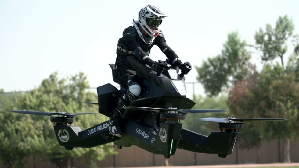 The Hoverbike S3 2019 can be piloted remotely as a drone or ridden by an officer in the air.