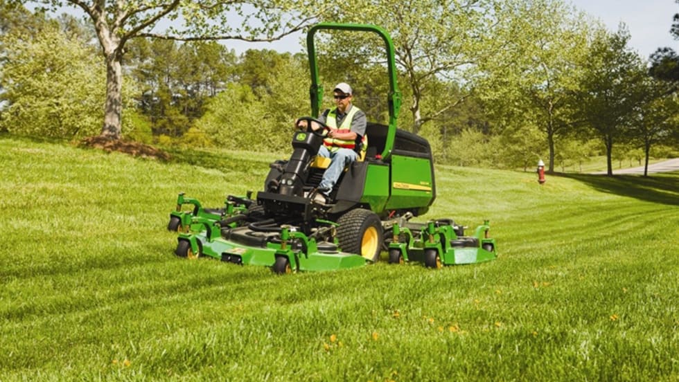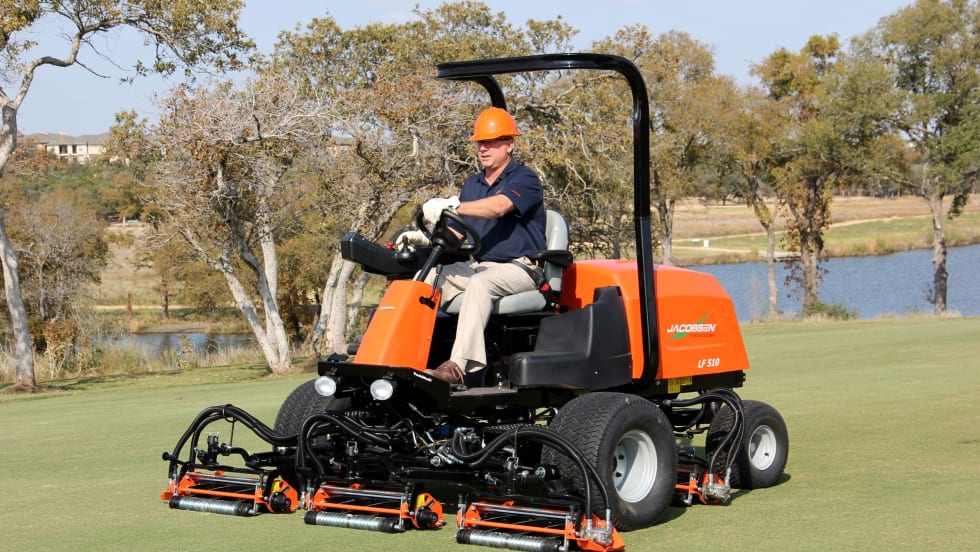 The Jacobsen LF510 five-gang fairway mower features a 100-inch width-of-cut, five-inch TrueSet cutting, units and a final Tier 4 Kubota diesel engine.