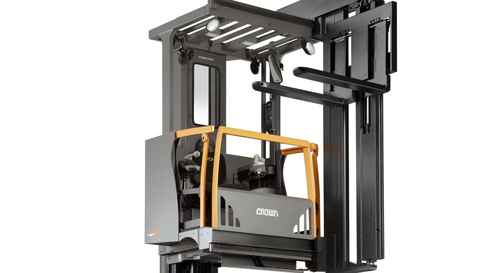Crown Equipment Corporation's TSP 7000 and TSP 6500 Series Turret Trucks, featuring the company's MonoLift mast, offer faster lift speeds, more capacities, higher elevations, and greater operator control and comfort.