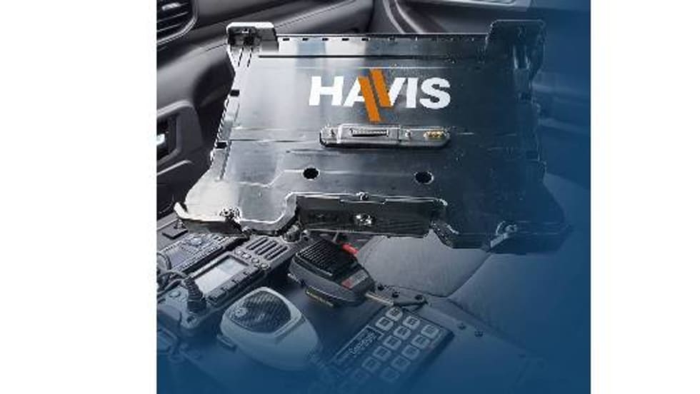 The Havis DS-GTC-300 Series docking station is designed for the Getac V110 rugged convertible notebook and offers computer charging, security, and connection to peripherals inside the vehicle. A guided, floating docking connector maintains connectivity.