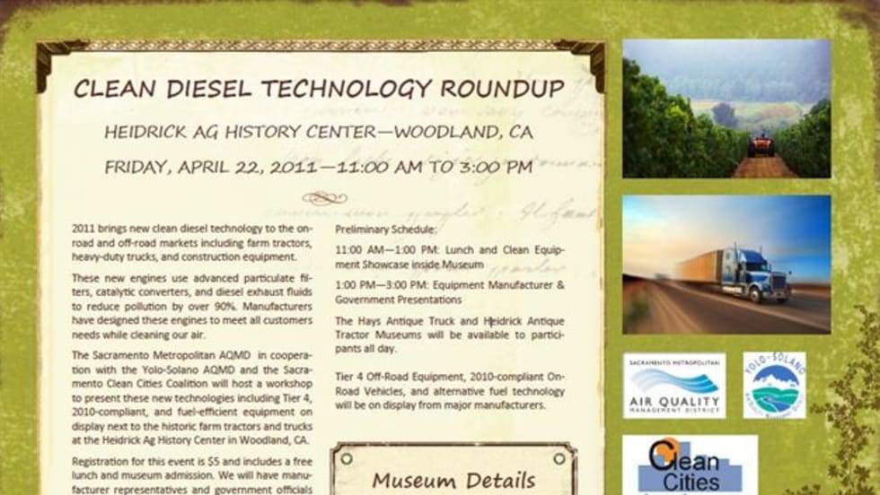 SACRAMENTO, CA - The Sacramento Metropolitan AQMD in cooperation with the Yolo-Solano AQMD and the Sacramento Clean Cities Coalition will host a workshop to present new clean diesel technologies on Friday, April 22.