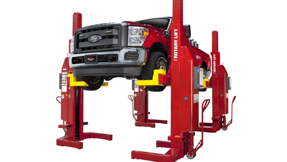 Rotary's new Mach Flex powered by RedFire wireless mobile column lifting system puts the ability to lift more than 150,000 pounds in technicians' hands with a patent-pending remote control.