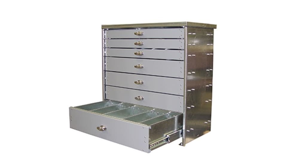 Lockers by CargoEase are composite and aluminum drawer cargo storage units designed for use in trucks and vans.