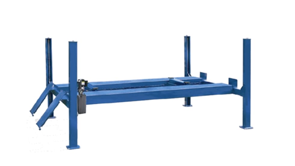 The Eagle Equipment Four-Post Service Lift is a cable-driven lifting system with a 12,000-pound capacity that features 20-inch runways.