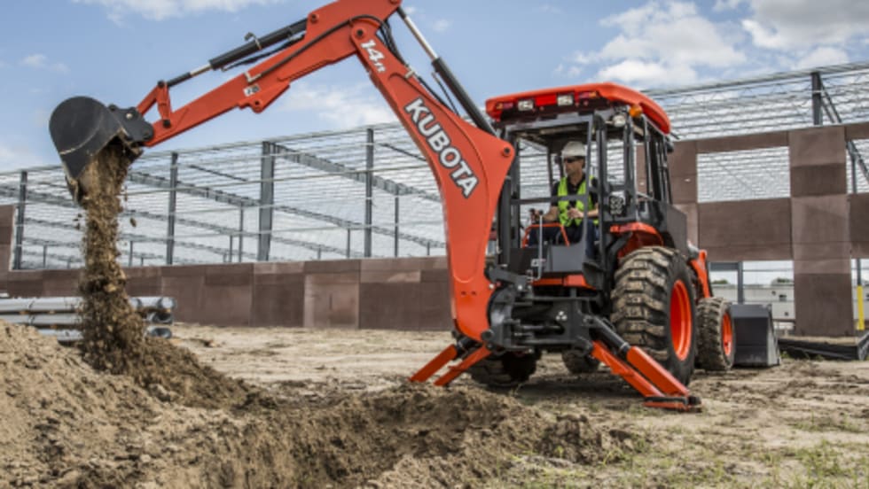 Kubota's new L47 and M62 tractor loader backhoes feature single-lever hydraulic connection for simple coupling and uncoupling of auxiliary implements.