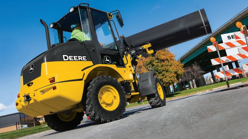 John Deere’s 244K and 324K compact wheel loaders are equipped with a Final Tier 4 diesel engine with a two-speed transmission.