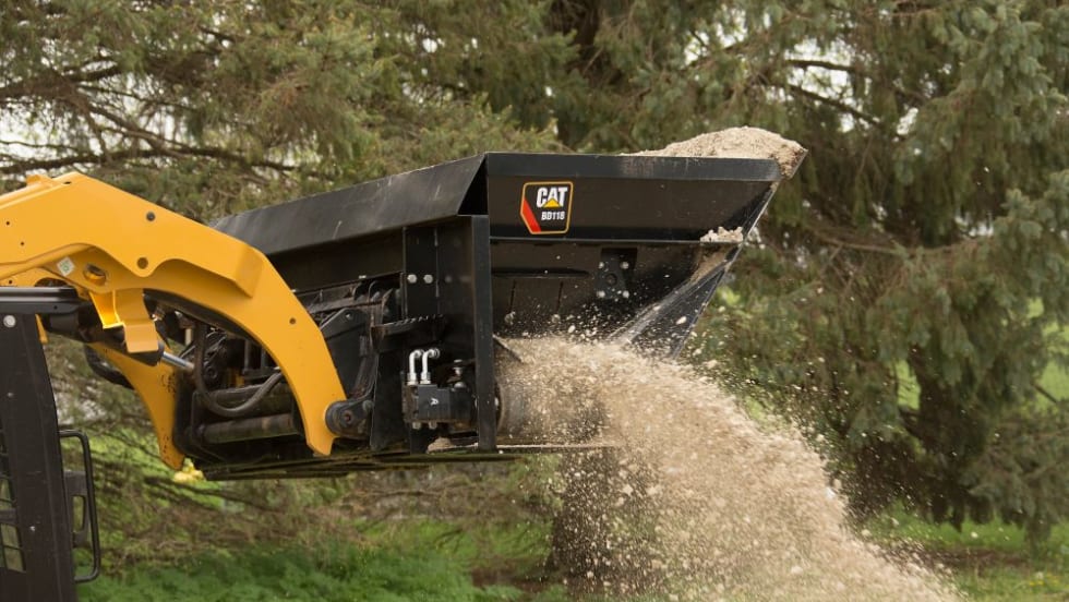 Cat Side Discharge Buckets collect and transport loose materials such as sawdust, sand, mulch, and topsoil and then discharge these materials.