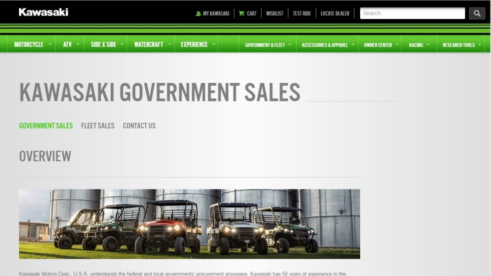 To help facilitate government and fleet sales and to add awareness to its internal sales programs, a government and fleet sales section has gone live on Kawasaki.com.