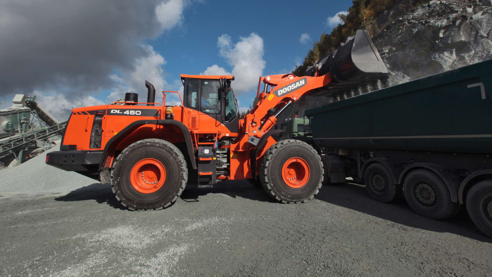 The Doosan DL450 wheel loader is interim Tier 4 (iT4) compliant and includes improvements ranging from more engine horsepower to increased optional driving power and steering capabilities.