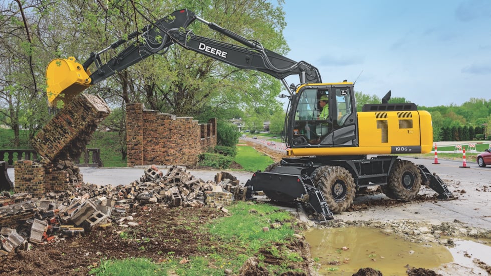 The updated John Deere 190G W excavator provides customers with a “Swiss army knife” for clearing ditches, repairing sewers or potholes, or loading trucks.