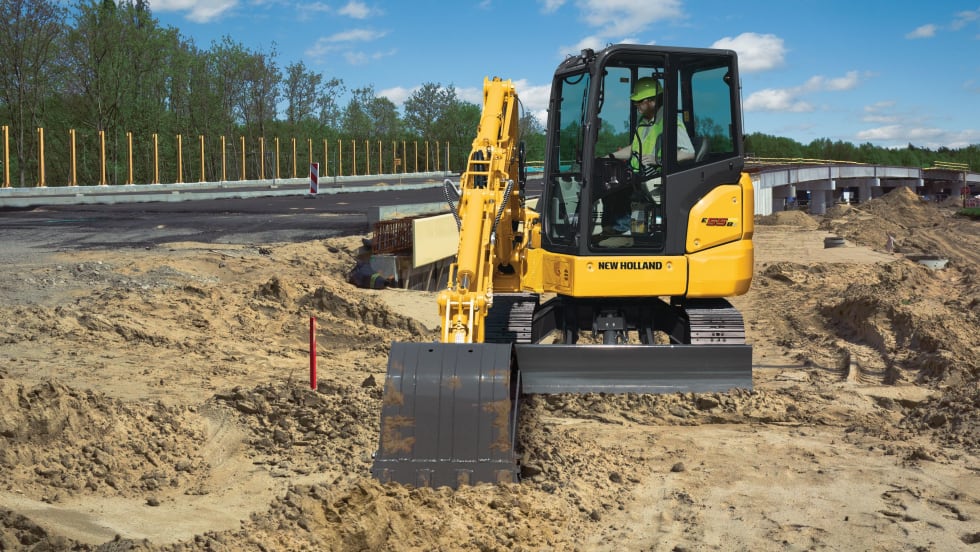 New Holland Construction’s E55BX short radius mini-excavator is built on a short radius platform with minimal tail swing overhang.
