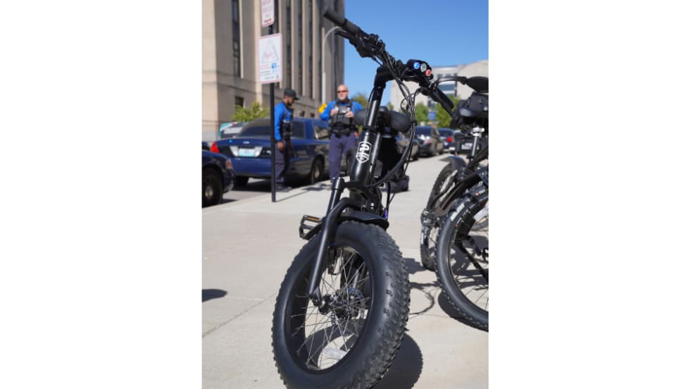 The e-bike extends the range of patrols and eases the physical burden on officers who laden down with 40 lbs. of equipment.