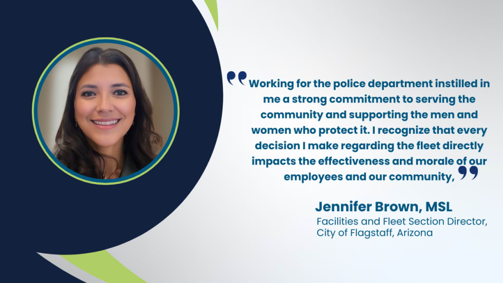 “Working in law enforcement prior to transitioning to fleet management provided me with invaluable experience and insights that greatly influence the decisions I make today,” says Jennifer Brown, facilities and fleet section director for the city of Flagstaff, Arizona.