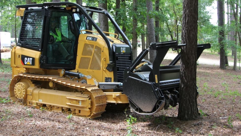 The factory-built Cat D3K2 Mulcher can be used for right-of-way construction/maintenance, site development, tree management, and fire-break clearing.