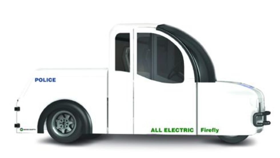 The Firefly is a three-wheeled electric utility vehicle that can be used by local police departments, universities, and fleet motor pools as an emissions-free alternative to gas-powered options and entry-level battery electric vehicles.
