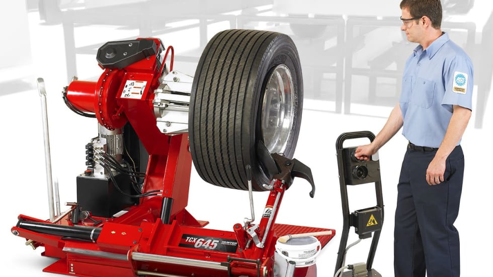 The TCX625 Plus includes Hunter's heavy-duty tire changer and a variety of time-saving accessories. Its service times are comparable to manual methods with a safer pedal-controlled inner roller.
