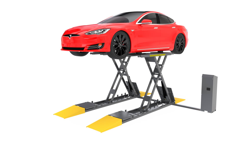 The SP-7XE scissor lift lays flat and raises a vehicle six feet with open center below.