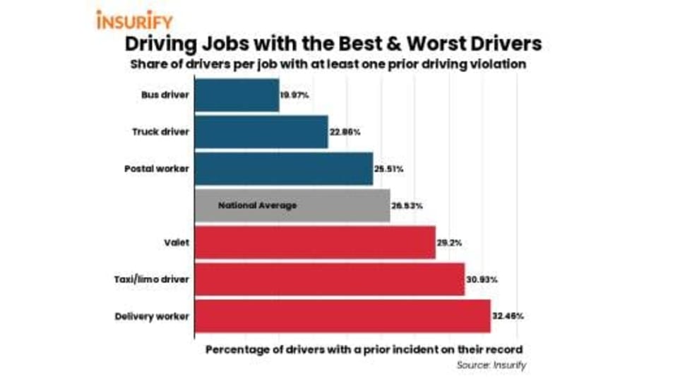 Based on the percentage of drivers with a prior incident on their records, Insurify identifies bus, postal, and truck drivers as the best, and valet, limo, and delivery workers as the worst.