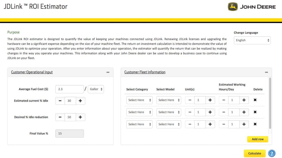 The new JDLink return on investment (ROI) estimator by John Deere is designed to quantify the value of keeping machines connected using JDLink telematics.