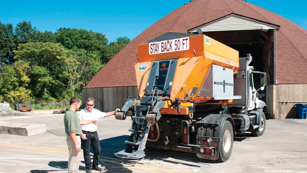 An Epoke spreader can be used to distribute seven different kinds of materials: salt, sand, split-stone, pre-wetted dry material, liquid, liquid combined with dry material, and pre-wetted dry material and liquid.