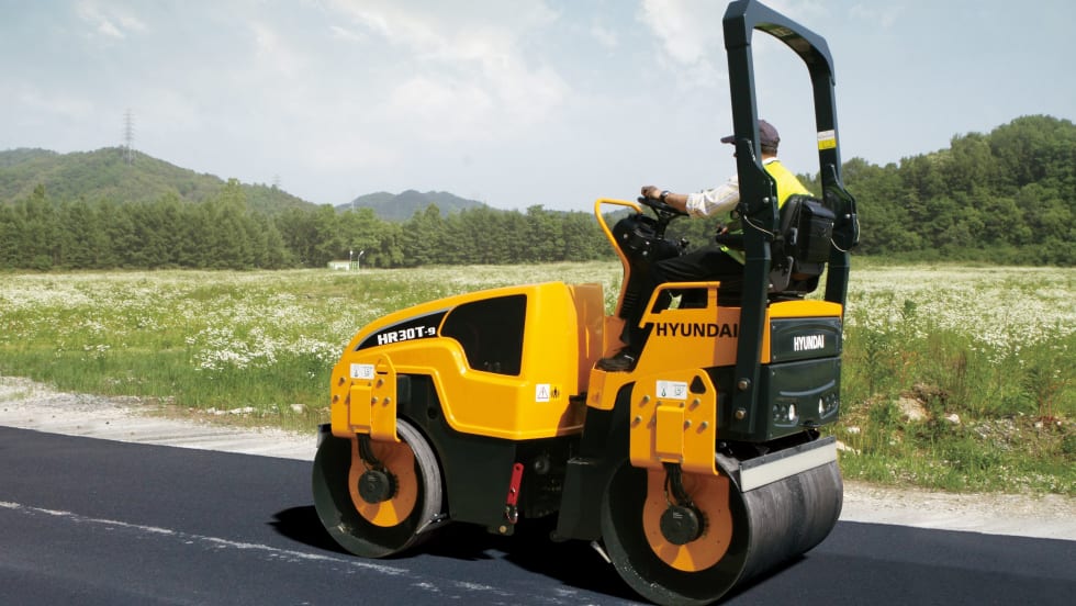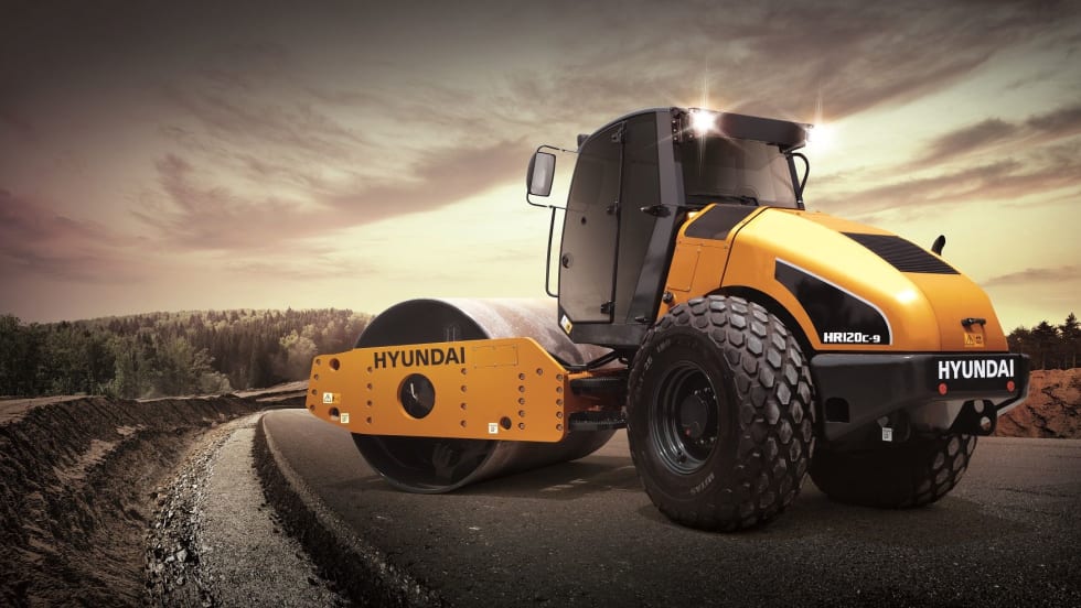 The HR120C-9 compaction roller from Hyundai is a single drum vibratory roller suitable for soil and aggregate compaction in applications such as residential and commercial site prep and road construction.