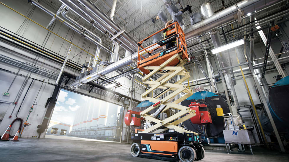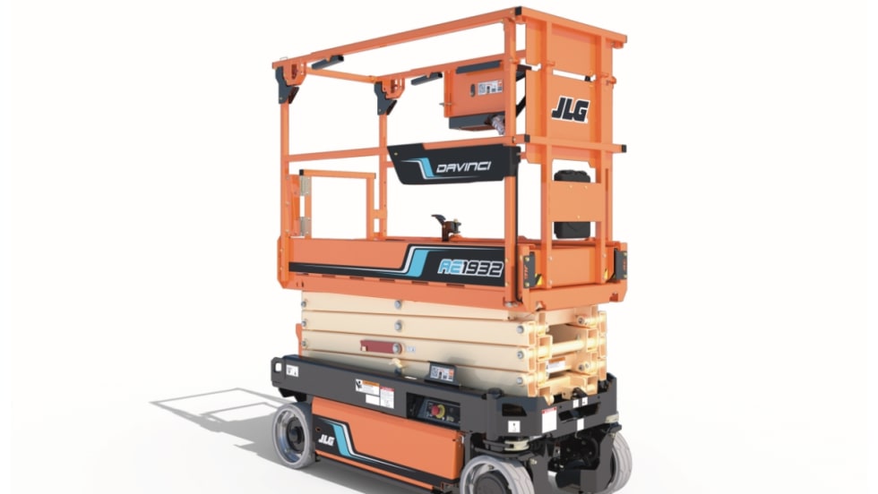 The all-electric DaVinci AE1932 scissor lift from JLG Industries features a lithium-ion battery, which can power the drive and steer systems at a lower cost.