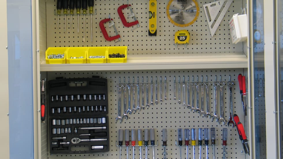 The 5S Cabinet from Vidmar stores the same amount of tools as five open-shelving units in a smaller space.