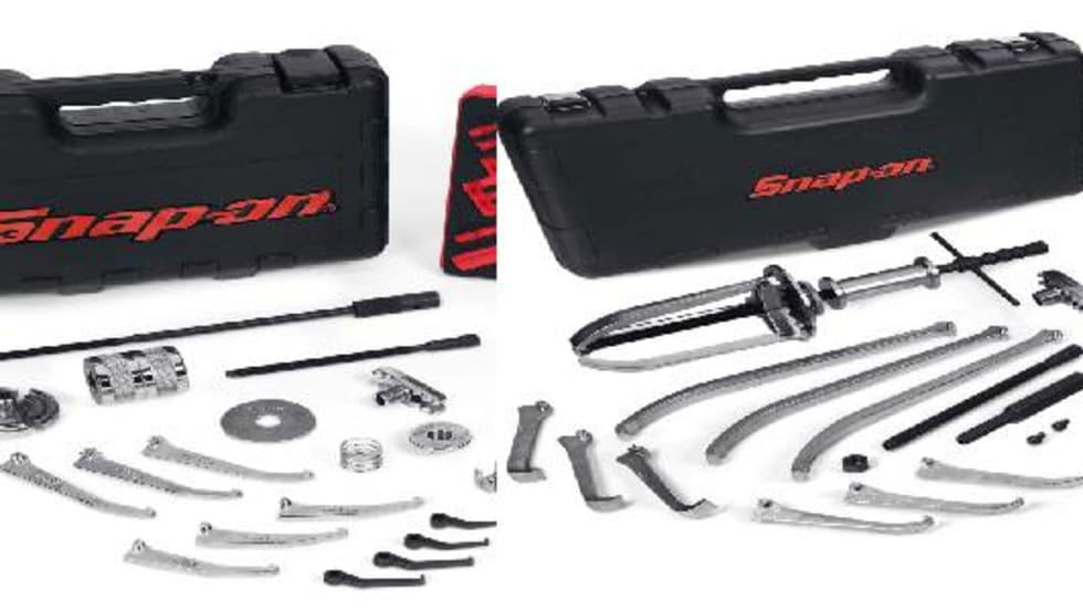 Technicians can remove vehicle parts quicker and with less effort using the Snap-on CJ2500 heavy duty manual interchangeable master puller set and CJ2400 light duty manual interchangeable master puller set.