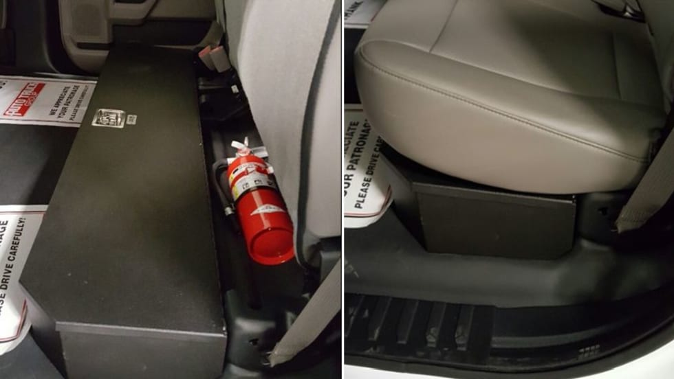 The custom-designed weapon box can accommodate a shot gun and/or rifle and fits beneath the back seat of several Ford truck models.