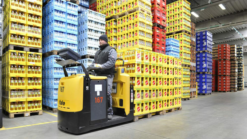 Yale Materials Handling Corporation’s MO25 center rider lift truck eases second level order picking through its fully adjustable electronic power steering, automatic speed reduction in cornering, and suspended platform with an operator-sensing floor mat.
