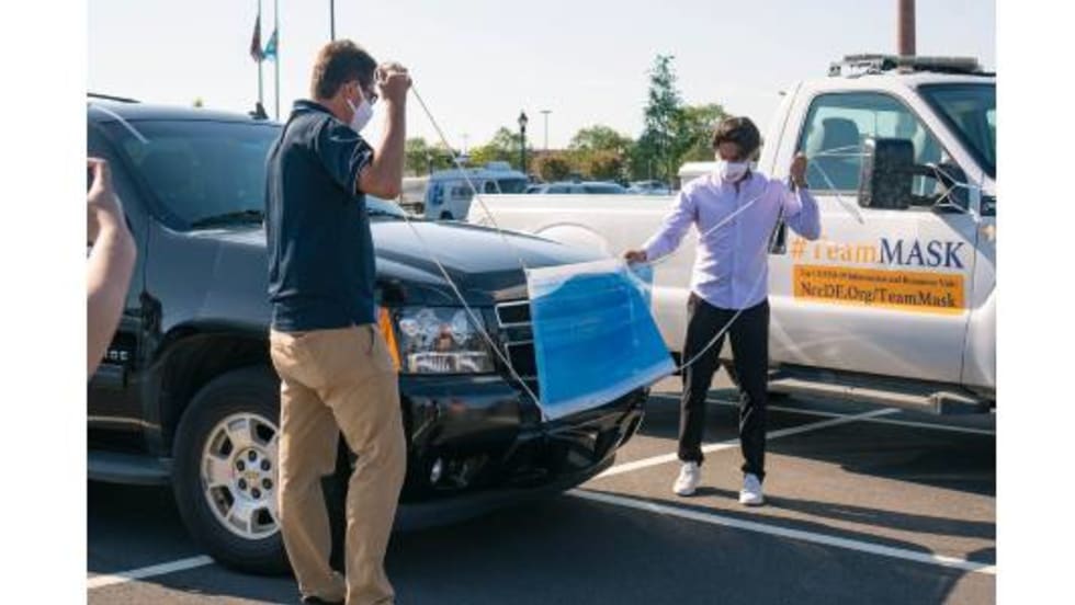 Gigantic face masks have been placed on New Castle County, Del. government vehicles as part of a public awareness campaign to curb the spread of COVID-19.